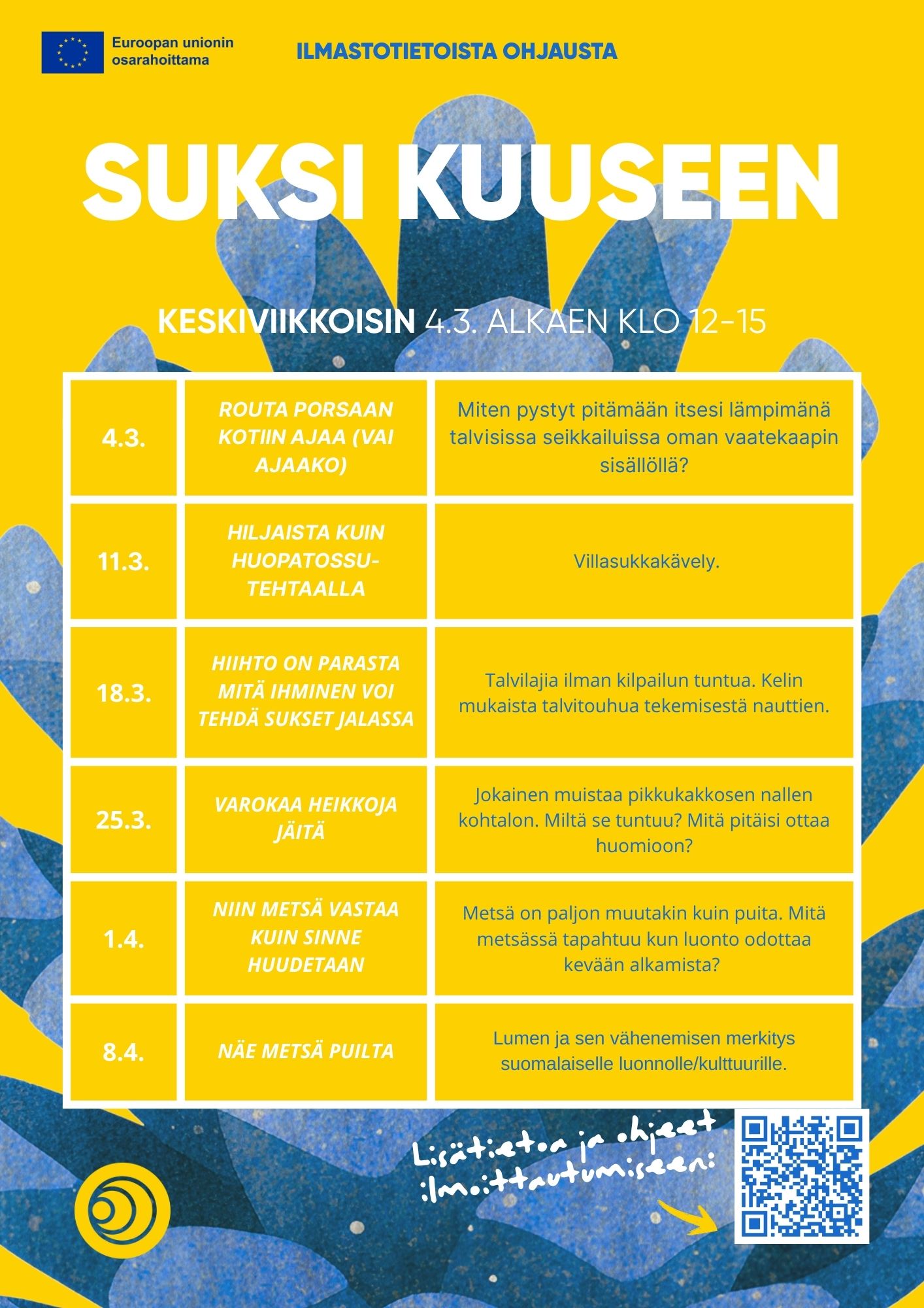 Kuuden viikon ajan pääsemme tutustumaan talviretkeilyyn, oppimaan lisää metsien suojelun ja luonnon monimuotoisuuden tärkeydestä sekä seikkailemaan talvisessa metsässä.