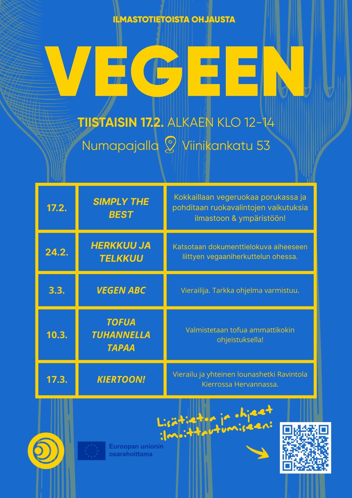 Keväällä kokoonnumme viisi tiistaita yhteisen ruokapöydän ääreen. Pajan keittiössä kokeilemme vegaanisia vaihtoehtoja, keskustelemme ruoantuotannon mahdollisuuksista ja haasteista sekä perehdymme monipuoliseen kasvisruokavalioon.